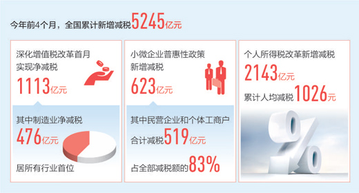国家税务总局30日公布的最新数据显示,今年前4个月,全国累计新增减税5245亿元。