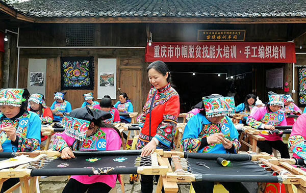 酉阳县子月苗族文化有限公司负责人陈国桃正在指导贫困村留守妇女学习苗绣技艺。