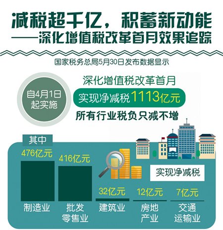 数据显示,2019年1~4月,个人所得税改革新增减税2143亿元,累计人均减税1026元;小微企业普惠性政策减税623亿元。深化增值税改革首月实现净减税1113亿元。经测算,降低社会保险费率全年有望为企业减负3000多亿元。