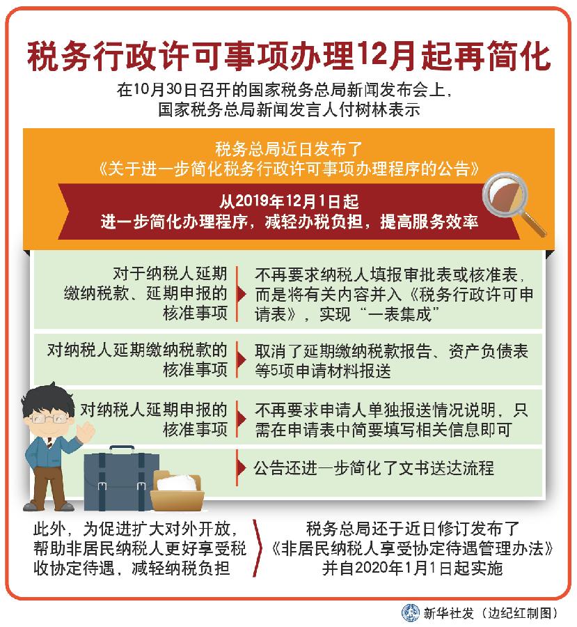 在10月30日召开的国家税务总局新闻发布会上,国家税务总局新闻发言人付树林表示,税务总局近日发布了《关于进一步简化税务行政许可事项办理程序的公告》,从今年12月1日起,进一步简化办理程序,减轻办税负担,提高服务效率。